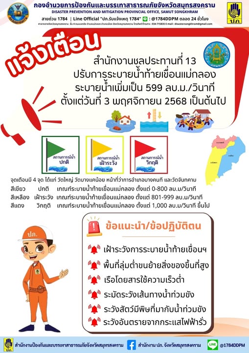 แจ้งเตือน การระบายน้ำท้ายเขื่อนแม่กลอง ตั้งแต่วันที่ 3 พฤศจิกายน 2568 เป็นต้นไป