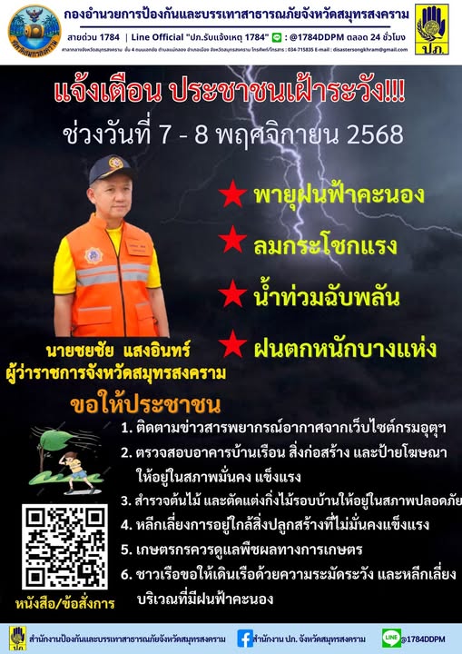 แจ้งเตือน เฝ้าระวังพายุ ฝนฟ้าคะนอง ลมกระโชกแรง ฝนตกหนัก น้ำท่วมฉับพลัน ในช่วงวันที่ 7-8 พฤศจิกายน 2568