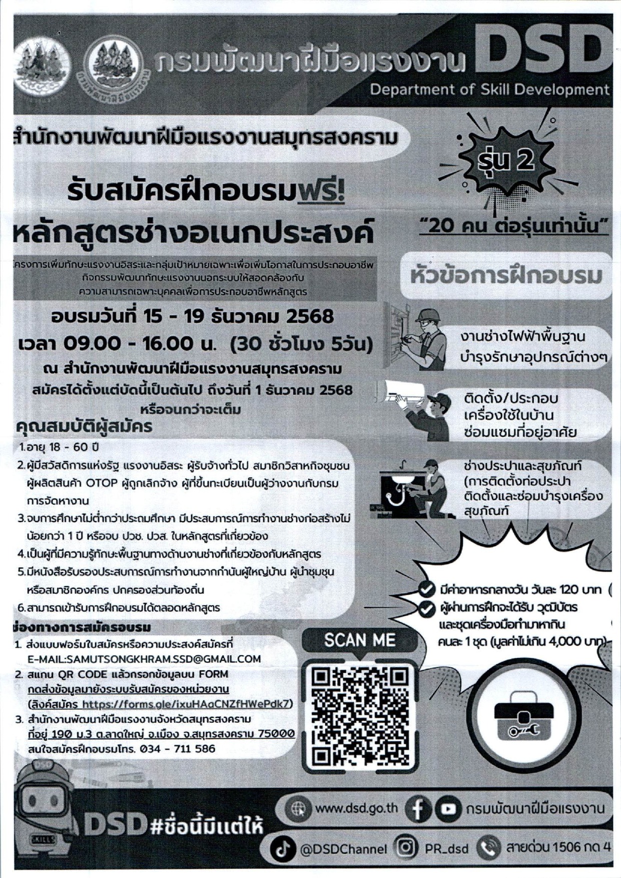 สำนักงานพัฒนาฝีมือแรงงานสมุทรสงคราม รับสมัครฝึกอบรม หลักสูตรช่างอเนกประสงค์