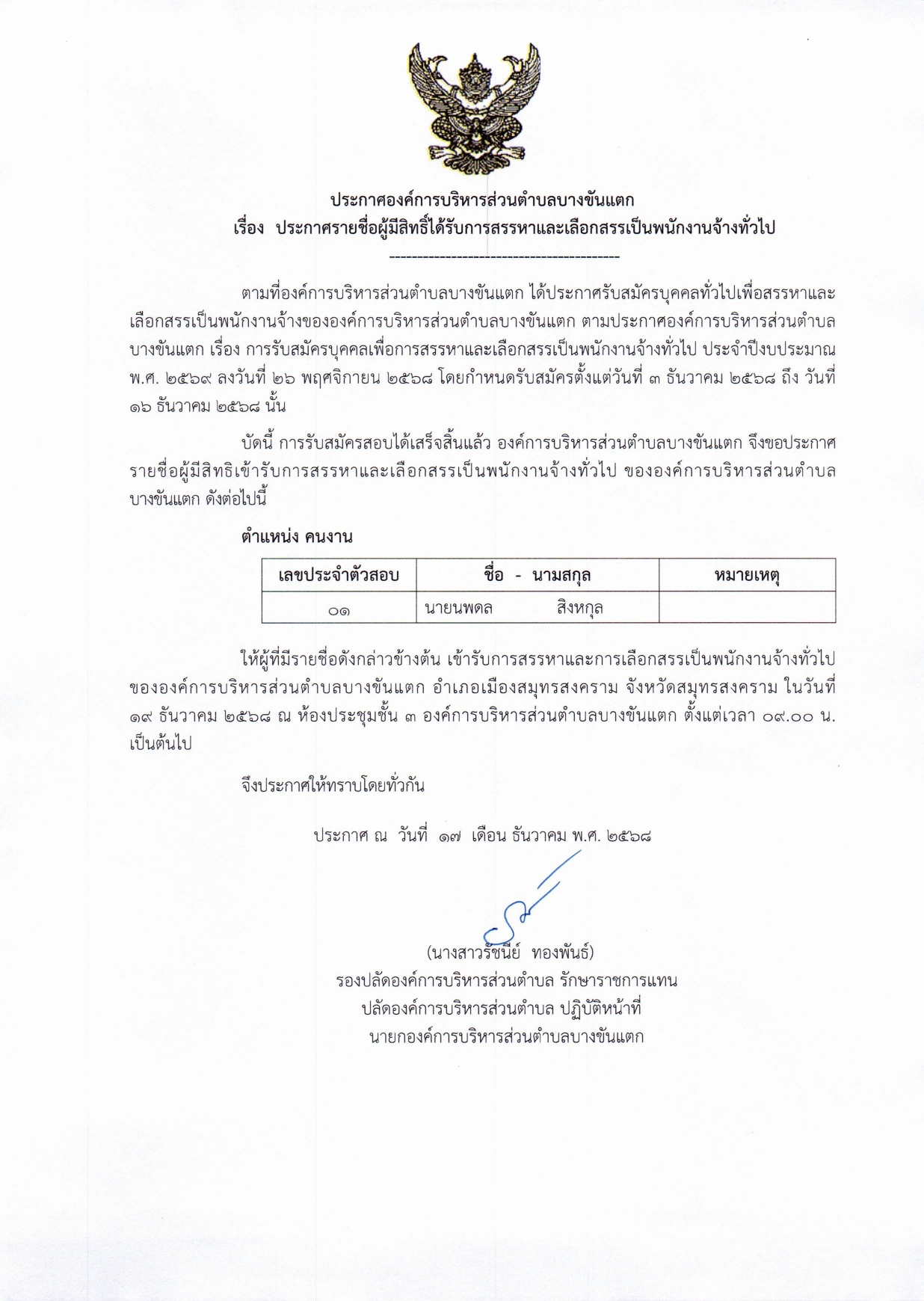 📌 เรื่อง ประกาศรายชื่อผู้มีสิทธิ์ได้รับการสรรหาและเลือกสรรเป็นพนักงานจ้างทั่วไป