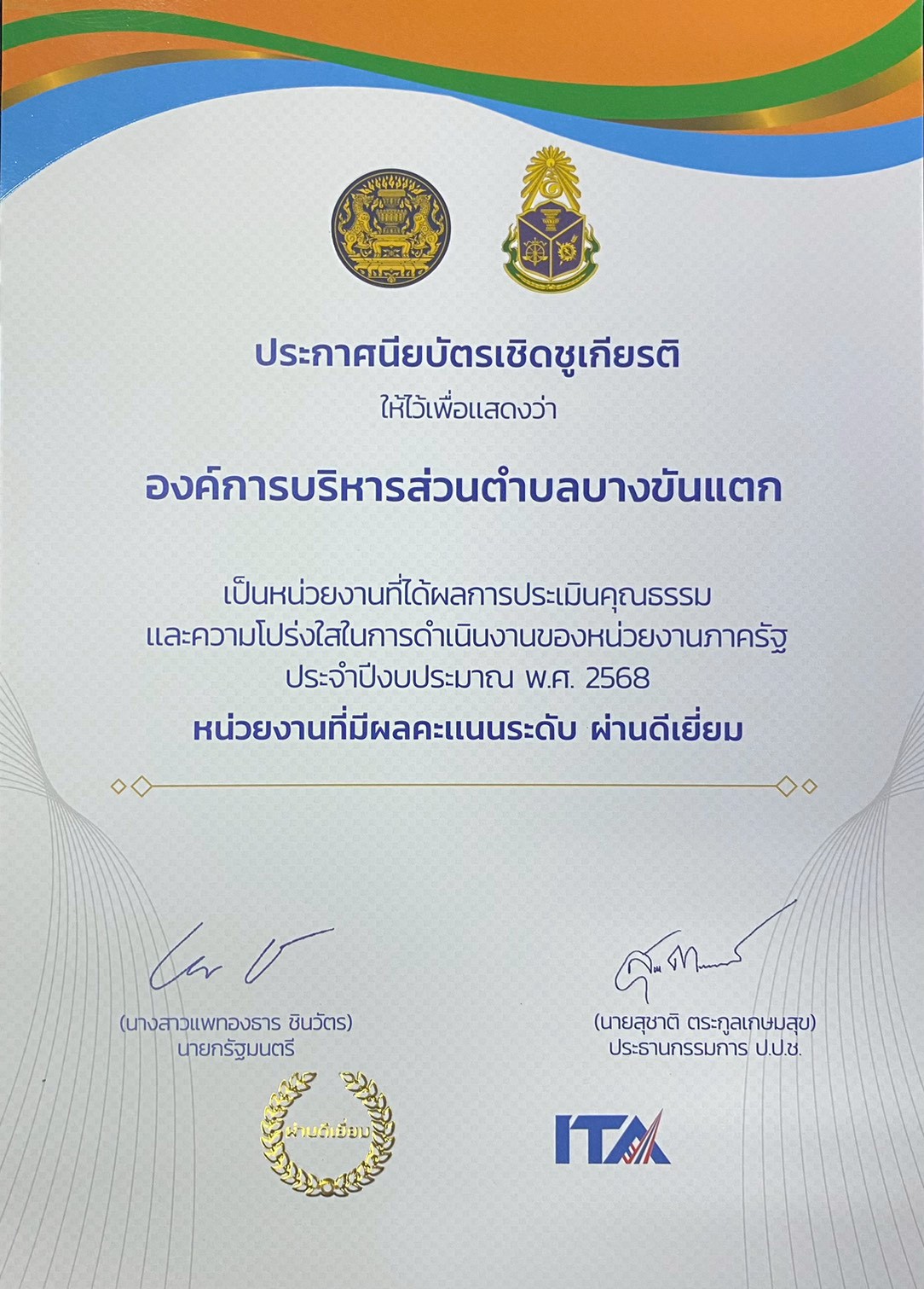 ได้เข้ารับประกาศนียบัตรเชิดชูเกียรติ การประเมินคุณธรรมและความโปร่งใสในการดำเนินงานของหน่วยงานภาครัฐ ประจำปีงบประมาณ พ.ศ. 2568