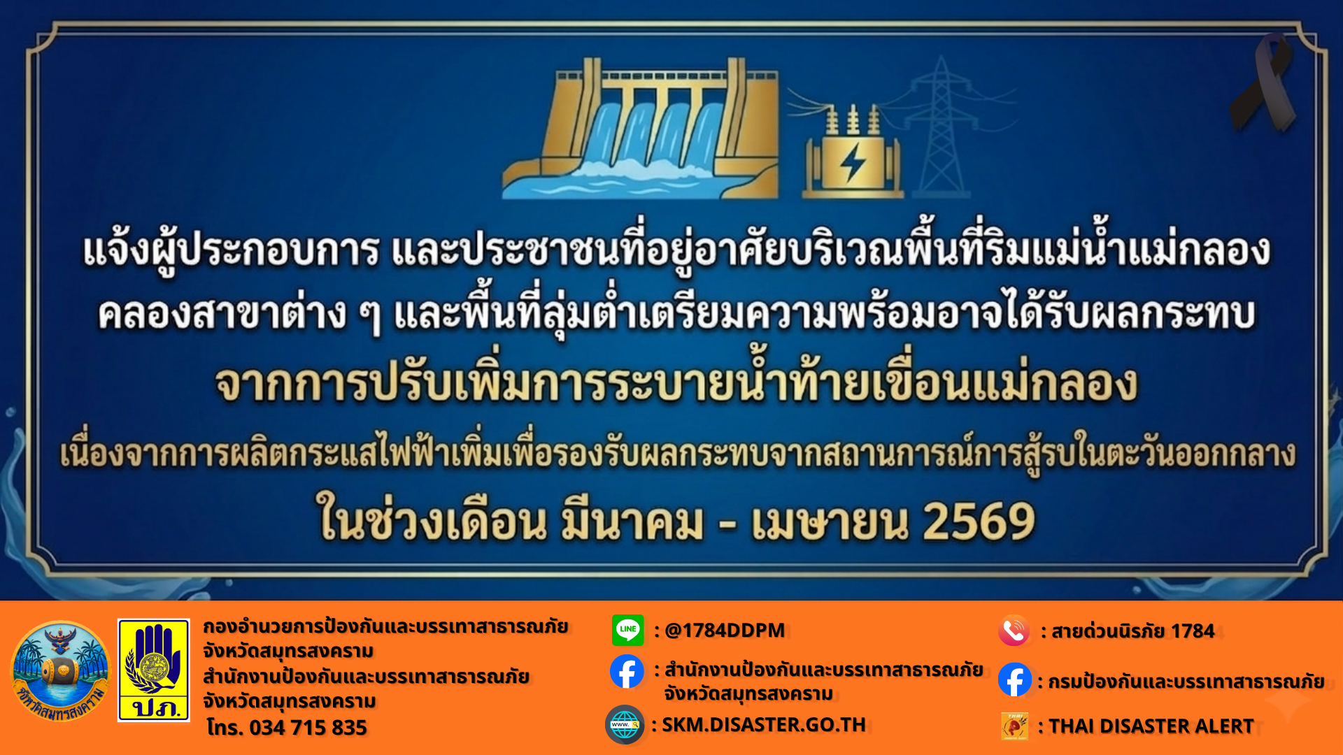 แจ้งเตือน เตรียมความพร้อมอาจได้รับผลกระทบจากการปรับเพิ่มการระบายน้ำท้ายเขื่อนแม่กลอง |