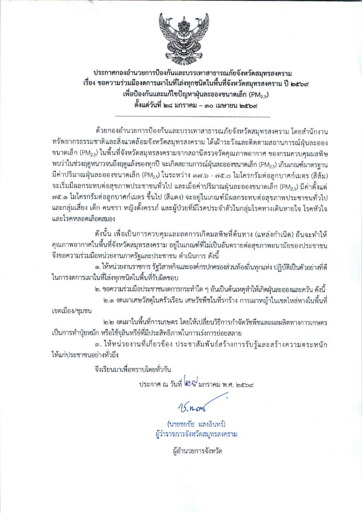 ประกาศกองอำนวยการป้องกันและบรรเทาสาธารณภัยจังหวัดสมุทรสงคราม เรื่อง ขอความร่วมมืองดการเผาในที่โล่งทุกชนิดในพื้นที่จังหวัดสมุทรสงคราม เพื่อป้องกันและแก้ไขปัญหาฝุ่นละอองขนาดเล็ก (PM2.5) |