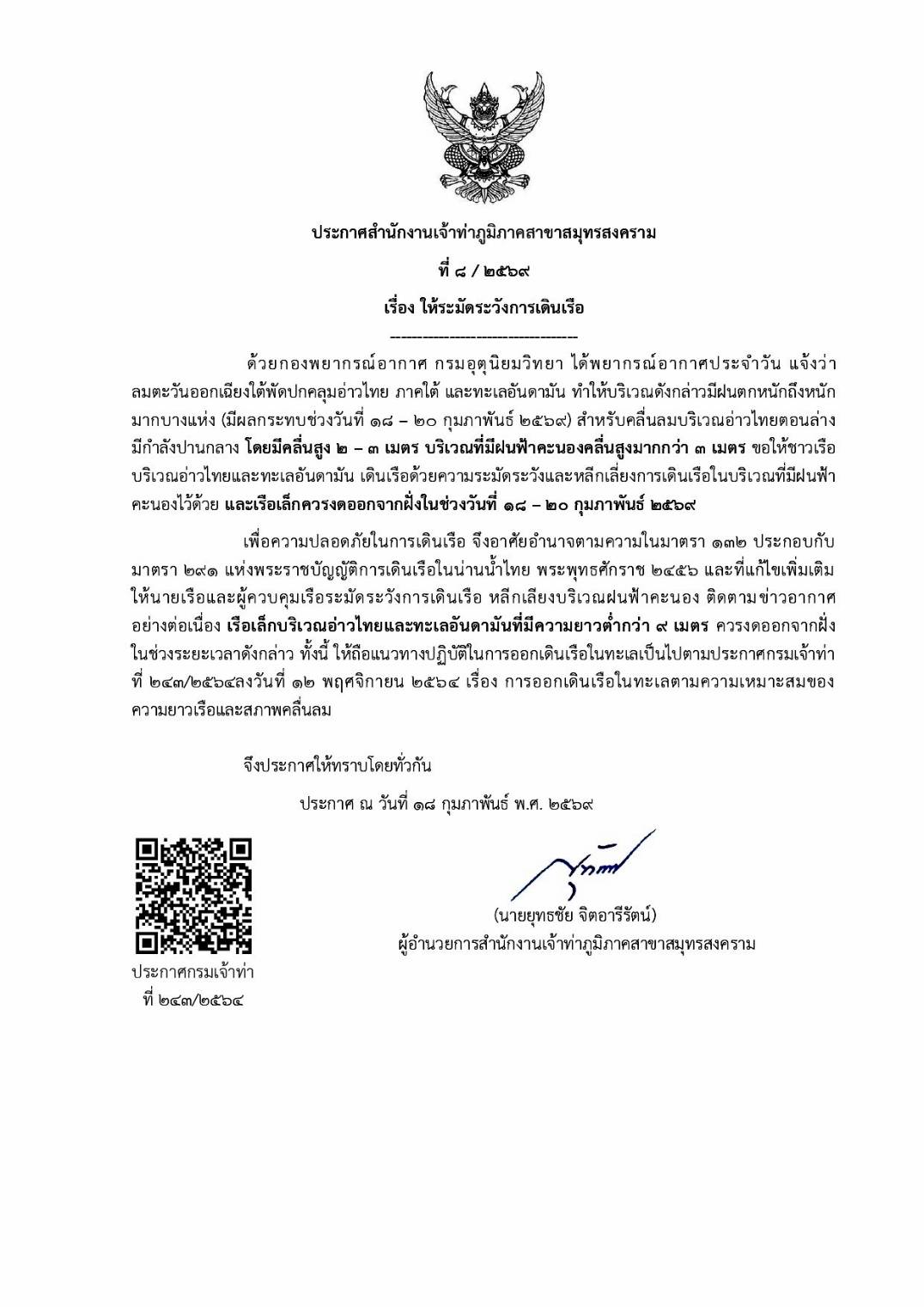 ประกาศสำนักงานเจ้าท่าภูมิภาคสาขาสมุทรสงคราม เรื่อง ให้ระมัดระวังการเดินเรือ |