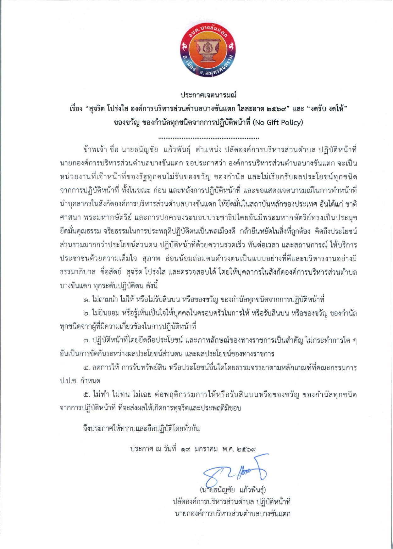 Announcement of Bang Khan Taek Subdistrict Administrative Organization Subject : Policy of not accepting neither gifts nor profits from performing duties (No Gift Policy) Fiscal year 2024